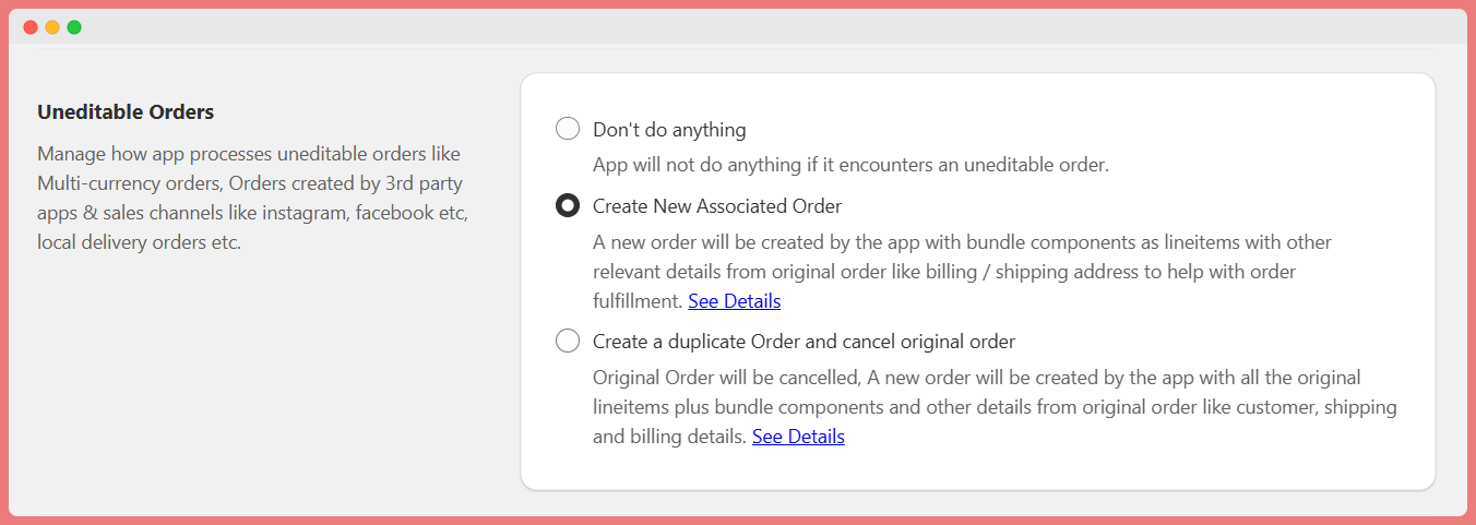 By default if any uneditable bundle orders comes, app will create a new order from the details of the original order like Billing and Shipping address, a note pointing to original order number, Custom Shipping line at 0 price pointing to original shipping line and all the bundle components as line items added a zero price, along with the reference custom line items showing the original bundle name. For clarification, In the original order notes, app mentions the order id of the associated order.