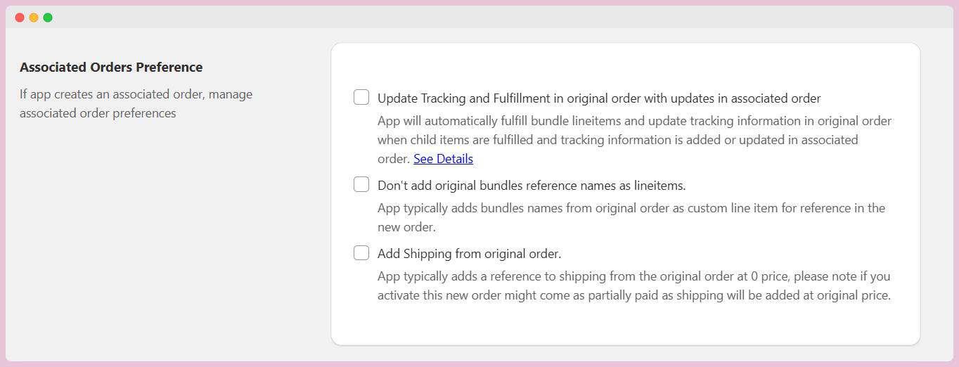 For fulfillment related personalization (App Settings --> Order Settings), you can choose not to add original bundle reference, add original shipping rate.